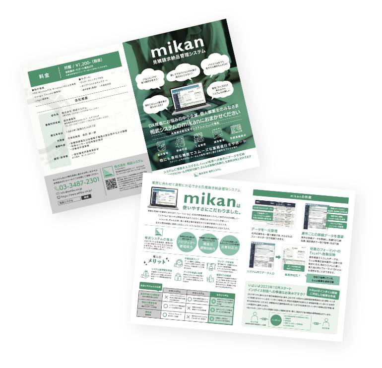 例えば、当社製品の「見積請求納品管理システムmikan」は、複雑なデータを一元管理できるだけではなく、データを任意のExcel帳票へ反映させることができます。導入前の業務と新システムに互換性を持たせることで、従来の管理業務に柔軟に対応しつつ、システム化による業務効率の向上を叶えます。